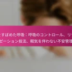 - ボックス呼吸: 4カウントで吸い込み、4カウントで保持し、4カウントで吐き出し、再度4カウントで保持します。このサイクルを数分間繰り返します。