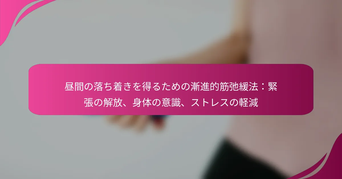 プログレッシブ・マッスル・リラクゼーション(PMR)は、異なる筋肉群を体系的に緊張させてリラックスさせることによって、ストレスを軽減し、落ち着きの感覚を促進する効果的な技法です。この実践は、身体的な緊張を解放するだけでなく、身体の認識を高め、日常のストレス要因に対処しやすくします。PMRを日中のルーチンに取り入れることで、全体的な健康状態や精神的な明晰さを大幅に改善することができます。